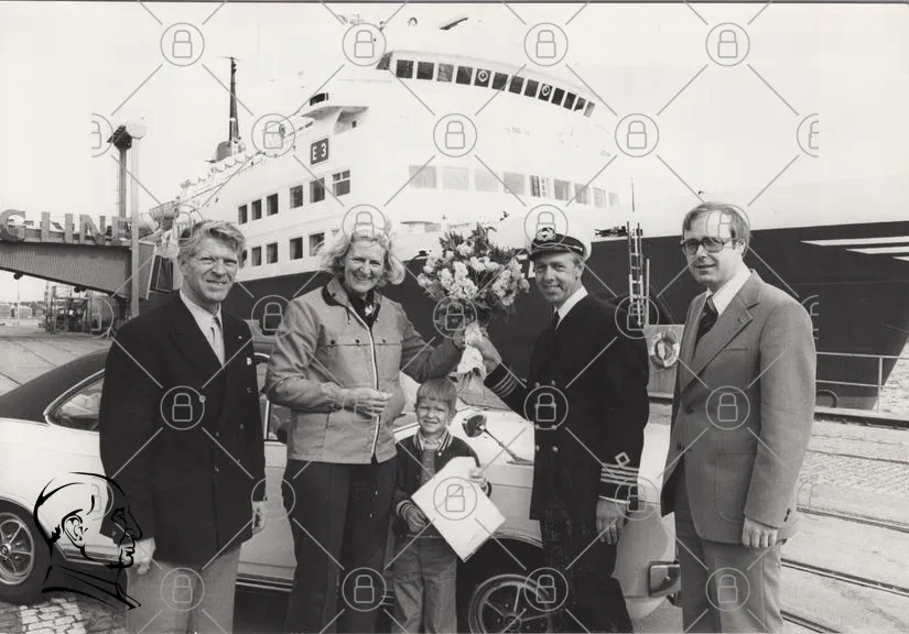 fartyg, hamn, män, barn, blommor, uniform, fotografi, 1970-tal, bil, maritim, besättning, kapten, ceremoni, gruppbild, svartvitt, historia, sjöfart, tradition, glädje, evenemang, möte, present, familj, vänskap, resor, hav, landskap, nostalgi, samarbete, fest