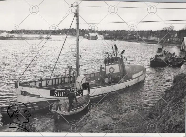 båt, hamn, vatten, segelbåt, motorbåt, fiskebåt, SUG 342, kaj, män, landskap, träd, svartvitt, båtliv, sjöfart, brygga, båtar, natur, sommar, skärgård, transport, arbete, tradition, historia, stillhet, reflektion, kust, sjö, ankarplats, fiske, fritid