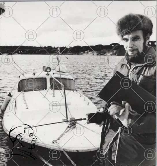 båt, man, vatten, sjö, brygga, vinterkläder, mössa, skägg, kamera, anteckningsblock, landskap, träd, himmel, svartvitt, fotografi