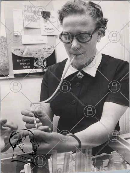 kvinna, glasögon, rör, medicin, spruta, svartvitt, sjukvård, vårdpersonal, händer, patient, kontor, 1960-tal, forskning, hälsa, medicinsk utrustning, professionell, arbete, klinik, behandling, medicinsk hjälp, rökning, information, affisch, utbildning, rådgivning, socialt arbete, medicinsk praktik, vårdmiljö, traditionell