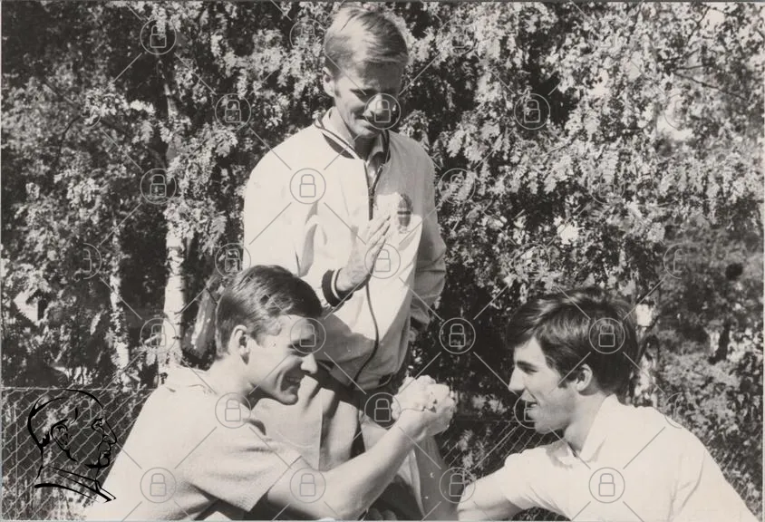 pojkar, armkamp, sport, tävling, utomhus, träd, 1960-tal, svartvitt, ungdomar, kamratskap, glädje, vinst, förlust, träning, samarbete, vänskap, kroppsspråk, fokus, entusiasm, leenden
