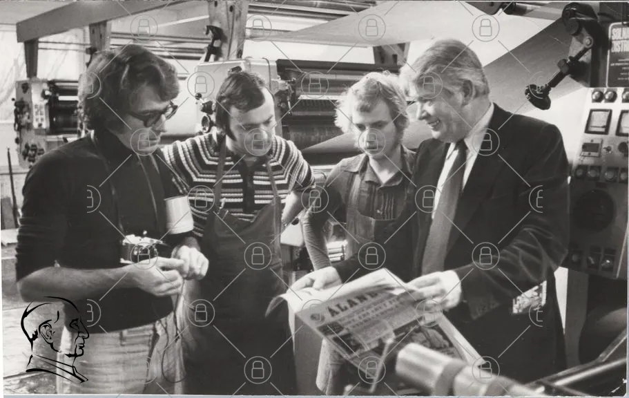 fotografi, svartvitt, tidning, tryckeri, män, kameror, arbetsplats, 1970-tal, diskussion, tidningsutgivning, kläder, glasögon, verktyg, teknik, samarbete, kreativitet, professionell, historia, dokumentation, grupp, arbete, tryckpress, information, media, kommunikation, nyheter, reportage, kultur, tradition