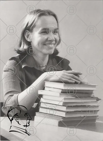 kvinna, leende, böcker, svartvit, porträtt, utbildning, litteratur, intellekt, studier, akademisk, kreativitet, kunskap, bibliotek, läsning, kultur, inspiration, fotografi, 1970-tal, stil, mode, avslappnad, hand, stapel, skratt, ansikte, uttryck, vänlighet, fokus, personlig, atmosfär