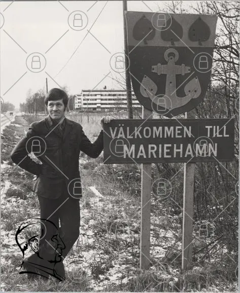 man, skylt, Mariehamn, välkommen, svartvitt, träd, byggnader, väg, landskap, 1970-tal, ankar, sköld, natur, fotografering, retro, historia, kultur, Finland, Åland, stad, landsbygd