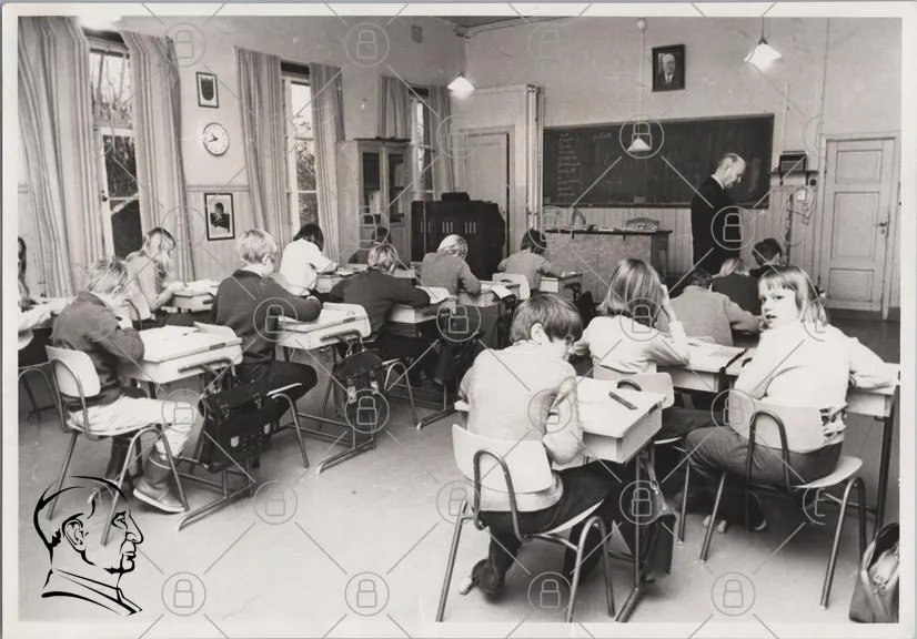klassrum, elever, lärare, skrivbord, böcker, skolmiljö, svart tavla, fönster, klocka, skoluniform, 1970-tal, undervisning, studier, skrivande, lärande, barn, ungdomar, traditionell skola, utbildning, koncentration, klasskamrater, lärande miljö, pedagogik, skolmaterial, klassrumsmiljö, lärande, skola, elever i fokus, lärarens roll, klassrumssituation