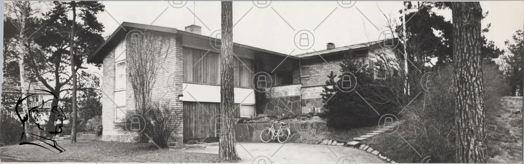 hus, byggnad, arkitektur, 1960-tal, cykel, träd, fasad, sten, fönster, gräsmatta, landskap, svartvitt, modernism, bostad, utomhus, gård, design, natur, stil, skandinavisk, enkelhet, miljö, hem, betong, tegel, trädgård, asfalt, väg, entré