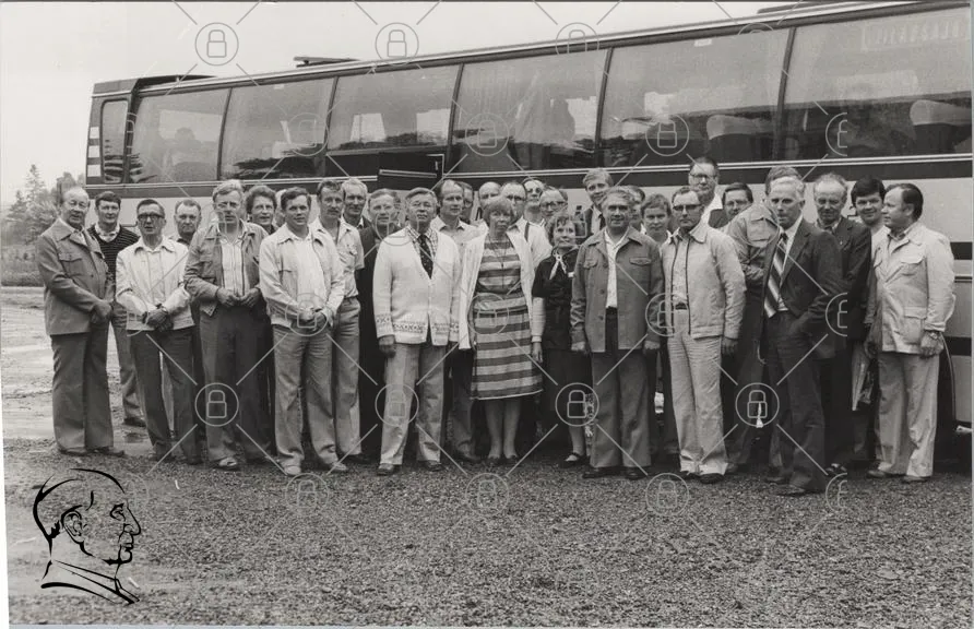 grupp, människor, svartvitt, foto, buss, kläder, 1970-tal, samling, utomhus, leenden, ansikten, traditionella, stil, man, kvinna, familj, vänner, resa, evenemang, gemenskap, minnen, historia, fotografi, samarbete, glädje, samhörighet, fest, aktivitet, nostalgisk, kultur