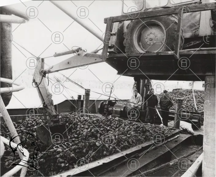 båt, lastning, skaldjur, ostron, maskin, arbete, män, industri, hav, fiske, transport, svartvit, utrustning, last, sjöfart, havsmiljö, mekanik, arbetsplats, tradition, produktion, natur, havsprodukter