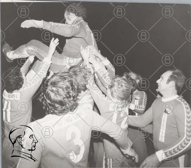 fotboll, lag, jubel, seger, spelare, svartvitt, sport, träning, gemenskap, glädje, viking, nummer 3, lyfta, fest, manliga, kläder, laganda, prestation, historisk, minne, tradition, samarbete, aktivitet, motion, tävling, händelse, firande, ungdomar, energi, passion, samling