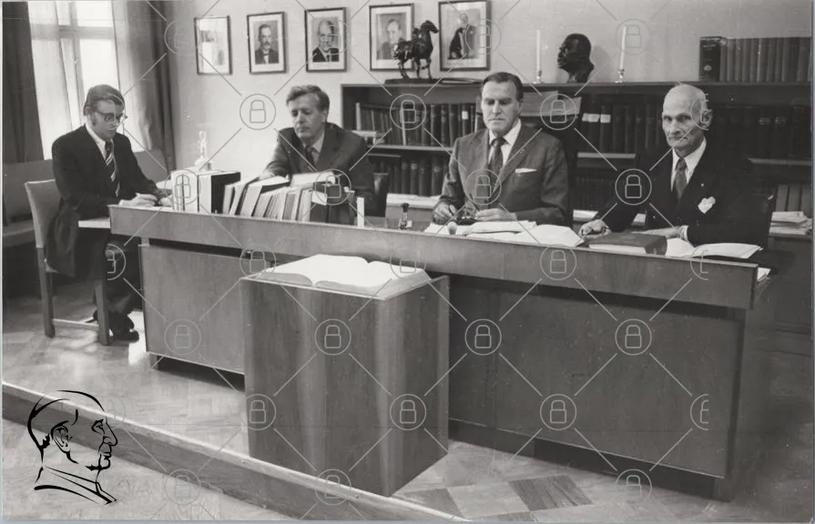 möte, bord, personer, dokument, böcker, svartvitt, inomhus, kontor, stolar, väggar, porträtt, skrivbord, anteckningar, lampor, staty, diskussion, formell, kläder, 1960-tal, ledarskap, politik, historia, samarbete, presentation, utredning, beslut, administration, myndighet, delegation, protokoll