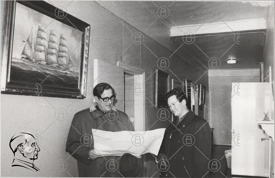 svartvitt, människor, inomhus, planritning, konst, segelbåt, väggkonst, kläder, diskussion, 1970-tal, interiör, dokument, man, kvinna, kontor, arkitektur, detaljer, ansiktsuttryck, samarbete, historisk, traditionell, stil, rum, möte, papper, skiss, plan, byggnad, design