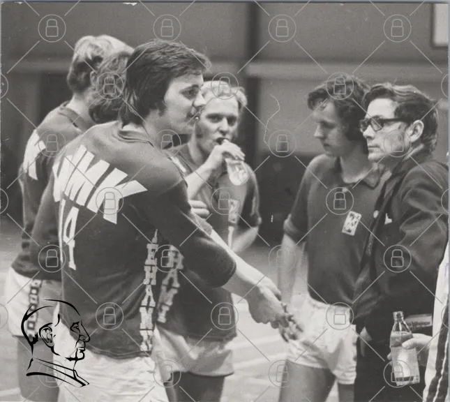 handboll, spelare, lag, träning, coach, sport, 1970-tal, svartvit, JMK, diskussion, idrott, tävling, ungdom, manliga, kläder, gym, samarbete, strategi, laganda, motion, aktivitet, fokus, samling, ledarskap, prestation, gemenskap, ungdomar, sportkläder, handbollsspelare, träningstillfälle
