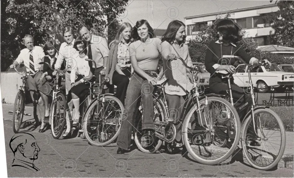 cyklar, kvinnor, män, 1970-tal, svartvitt, grupp, utomhus, mode, skratt, vänskap, ungdomar, gator, fotografering, cykelhjälm, kläder, stil, leende, gemenskap, cykel, landskap, träd, byggnader, nostalgi, fritid, aktivitet, cykeltur, glädje, samvaro, sport, motion