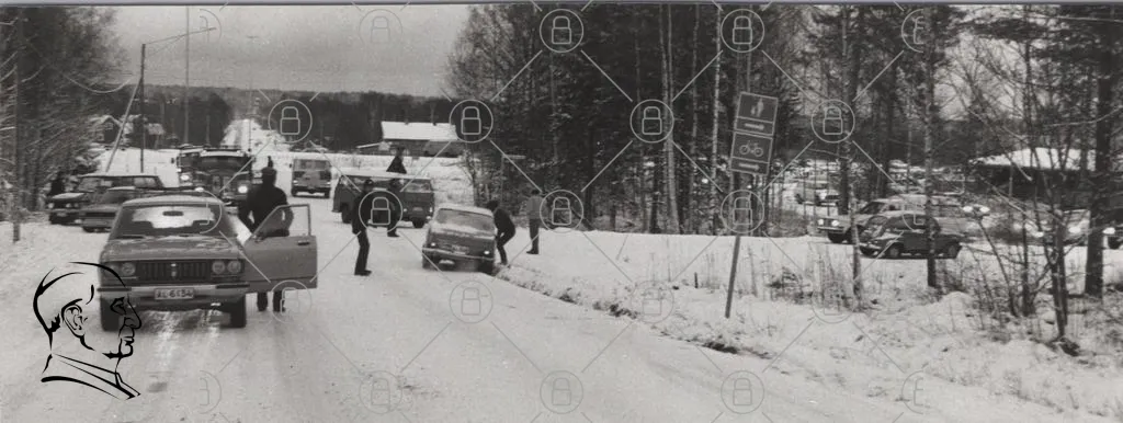 snö, väg, bil, människor, vinter, landskap, träd, trafikskyltar, hjälp, olycka, svartvitt, fordon, körning, snödrivor, landsväg, rural, natur, fotgängare, vinterkläder, vägskyltar, avåkning, bilproblem, samarbete, gemenskap, frusna, kallt, svårigheter, vägförhållanden