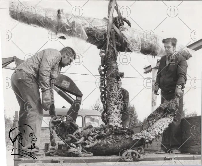 ankare, män, kedjor, lyft, gammal, rostig, båt, marin, arbete, historia, foto, svartvitt, utrustning, hav, sjöfart, arkeologi, upptäckte, föremål, lastbil, miljö, industri, teknik, bevarande, kulturarv, dykning, fynd, restaurering, skrot, metall, tunga