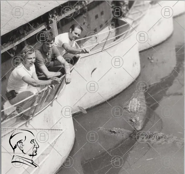 crocodiler, människor, vatten, djurpark, historisk, svartvit, fiske, säkerhetsnät, observation, reptiler, leksak, utfodring, natur, djurliv, turister, avgränsning, underhållning, djur, miljö, interaktion, fotografering, 1900-tal, utomhus, attraktion, besökare, spänning, äventyr, upplevelse
