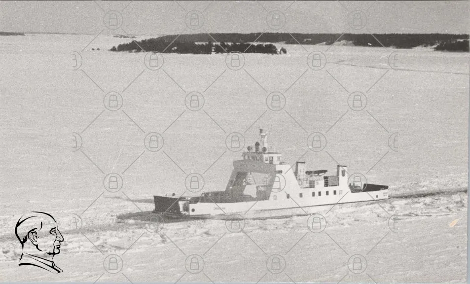 fartyg, is, hav, vinter, transport, sjöfart, landskap, skärgård, Sverige, svartvit, båt, sjö, öar, snö, navigering, frakt, passagerare, kust, vatten, isbrytare