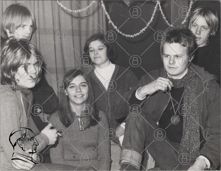 svartvitt, grupp, ungdomar, 1960-tal, kläder, smycken, inomhus, leende, cigarett, halsband, retro, fotografi, fest, stil, ansikten, dekoration, hår, mode, uttryck, gemenskap, nostalgi, kultur, vänner, avslappnad, samling, ungdomskultur, vintage, interiör, socialt, minnen