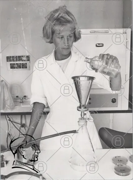 laboratorium, kvinna, vetenskap, experiment, glas, flaskor, pipett, forskning, vit rock, kemikalier, utrustning, mätning, hälsa, teknik, analys, akademisk, utbildning, professionell, 1970-tal, svartvitt, arbete, noggrannhet, precision, vätska, filtrering, laboratorieutrustning, observation, studier, forskningstekniker