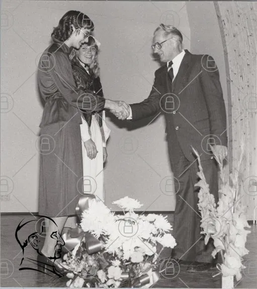 handshake, blommor, kvinnor, män, ceremoni, klänning, kostym, svartvitt, evenemang, presentation, leenden, publik, utmärkelse, tradition, festligheter, artighet, samarbete, kultur, historia, minne, gemenskap