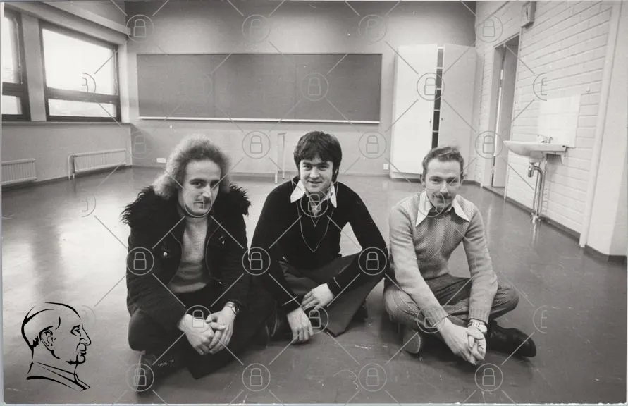 tre personer, svartvitt, inomhus, kontor, 1970-tal, kläder, frisyrer, sittande, leende, män, bakgrund, vägg, golv, dokument, avslappnad, gruppbild