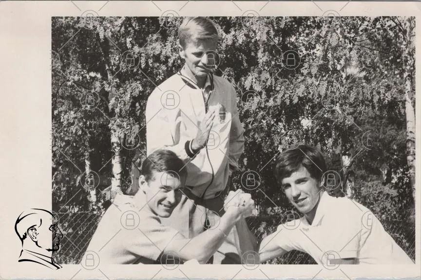 svartvit, foto, tre personer, sport, utomhus, träd, leende, vänskap, 1980-tal, manliga, kläder, armkrok, avslappnad, nostalgi, ungdomar, gemenskap, träning, tävling, skratt, minnen, retro, sommar, aktivitet, samarbete, glädje, natur, ungdomlig, kamratskap, sportiga kläder, armkrok