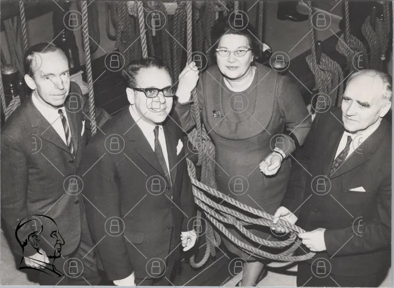 svartvit, grupp, människor, kostymer, slipsar, kvinna, män, rep, inomhus, 1960-tal, formell, porträtt, leende, kläder, vintage, historisk, samling, båt, marin, professionell, interiör, socialt, evenemang, traditionell, stil, ansikten, uttryck, samarbete, minnen, nostalgi