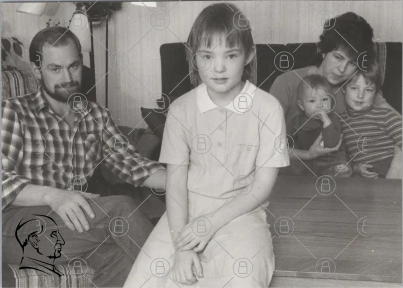 familj, barn, vuxna, inomhus, svartvitt, 1980-tal, leende, möbler, soffa, bord, kläder, interiör, fotografi, minnen, samvaro, syskon, föräldrar, baby, pojke, flicka, hem, nostalgisk, tradition, kärlek, gemenskap, ansikten, uttryck, barndom, tidsepok, familjebild, relationer