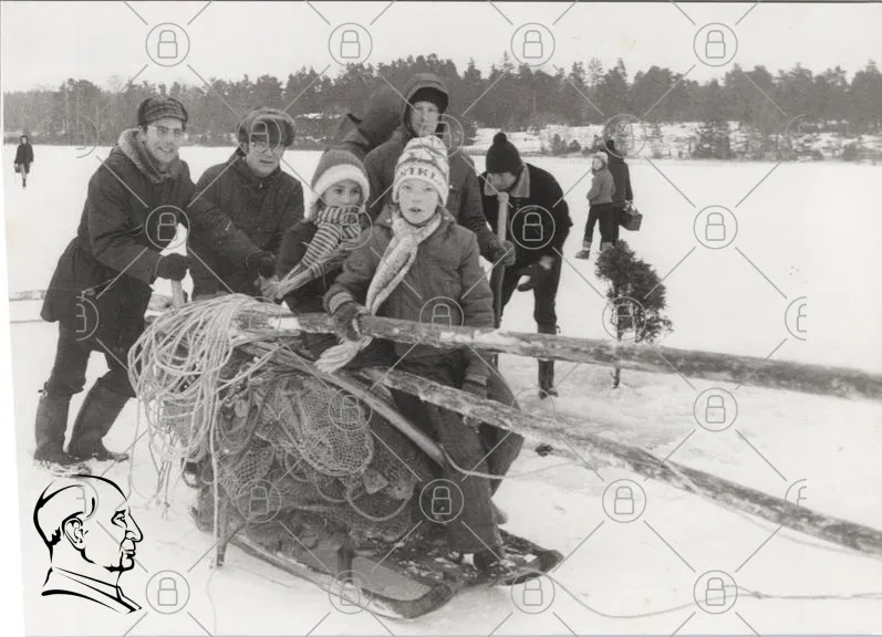 vinter, snö, släde, barn, vuxna, skridskor, is, sjö, träd, vinterkläder, mössa, halsduk, nät, utomhus, familj, fritid, vinterlandskap, skridskoåkning, tradition, glädje