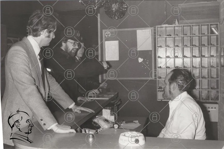 poliser, kontor, reception, 1970-tal, män, diskussion, telefon, dokument, skrivbord, glasögon, kostym, uniform, övervakning, ansiktsuttryck, interaktion, kontorsmiljö, vintage, svartvitt, myndighet, säkerhet, allvarlig, mänskliga relationer, samhälle, professionell, arbetsplats, kommunikation, överenskommelse, observation, situation, händelse