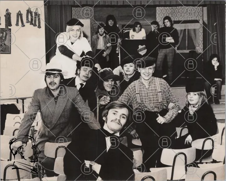 svartvitt, grupp, människor, kostymer, hattar, teater, scen, 1970-tal, skratt, underhållning, retro, skådespelare, publik, stolar, kläder, humor, föreställning, fotografering, vänskap, nostalgi
