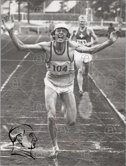 löpare, tävling, sport, 104, seger, glädje, historisk, svartvit, atlet, stadion, lopp, prestation, motion, idrott, 1970-tal, man, tröja, nummer, publik, energi, hastighet, fokus, uthållighet, framgång, triumf, loppmarkering, medalj, prestation, fotboll, gymnastik, träning