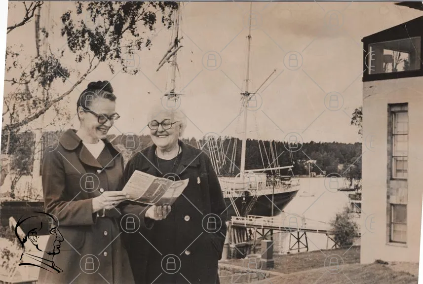två kvinnor, båt, hamn, träbåt, glasögon, broschyr, natur, träd, vatten, svartvitt, gammal bild, kläder, leende, vänskap, sommar, kaj, segelbåt, landskap, nostalgi, historia, utflykt, turist, båtliv, sjö, fotografi, 1900-tal
