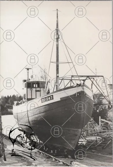 båt, skepp, hamn, träbåt, SF 3347, vatten, landskap, segel, fiske, marin, svartvit, byggnad, mast, kaj, trä, transport, sjöfart, historia, tradition, natur, stillhet
