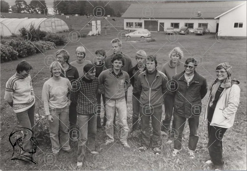 grupp, människor, svartvitt, utomhus, gård, kläder, 1970-tal, landskap, byggnad, fotografering, ansikten, samling, ungdomar, män, kvinnor, natur, träd, gräs, bilar, jordbruk, traditionell, gemenskap, leenden, stil, retro, historia, landsbygd, fritid, aktivitet, vänskap