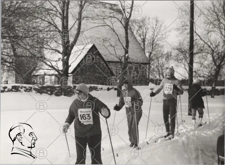 skidåkning, vinter, snö, tävling, nummerlappar, träd, hus, landskap, sport, utomhus, människor, kläder, gammal bild, svartvitt, motion, friluftsliv, skidutrustning, nummer 163, nummer 229, tradition, aktivitet, gemenskap, natur, kallt, skidspår, vinterlandskap, historisk