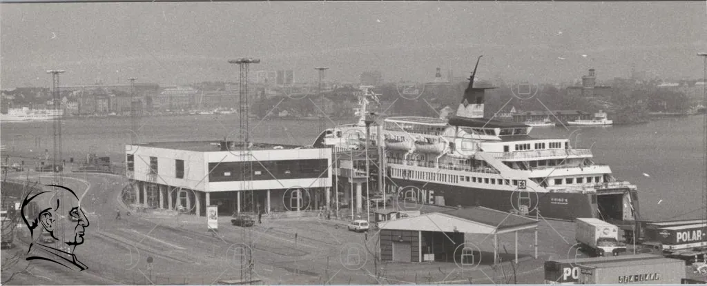 hamn, fartyg, byggnader, kaj, trafik, passagerare, lastbil, bilar, linje, industri, vatten, stad, transport, resor, ankomst, avfärd, terminal, utsikt, mast, kran, brygga, hav, gråskala, 1900-tal, europeisk, sjöfart, infrastruktur, hamnverksamhet, passagerarfartyg, lastfartyg