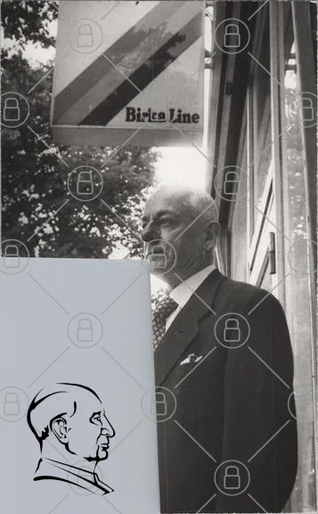 Birka Line, man, svartvitt, vintage, 1900-tal, kläder, kostym, slips, porträtt, skylt, träbyggnad, utomhus, träd, ansiktsuttryck, gammal, resebyrå, historia, fotografi, stil, klassisk, svensk, båt, färja, resor, maritim, kultur, nostalgi, tidsepok