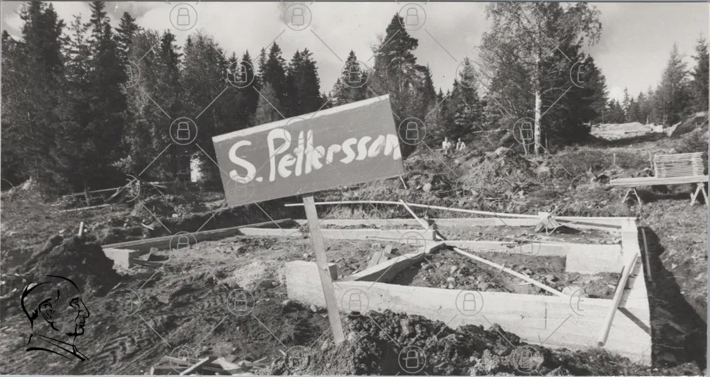 S. Pettersson, skylt, skog, byggarbetsplats, markarbete, svartvit, träd, natur, konstruktion, grävning, landskap, Sverige, jord, trä, anläggning, väg, staket, grus, projekt, arbete, identifiering, namn, signatur, fotomiljö, utomhus, historia, gammal, tradition, markerad, plats