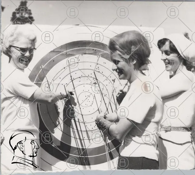 skytte, mål, kvinnor, 1960-tal, svartvitt, leende, sport, träning, gemenskap, tävling, pil, båge, fokus, precision, utomhus, aktivitet, tradition, glädje, samarbete, målskiva, skjutning