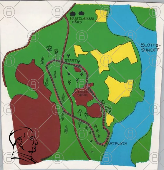 karta, Kastelholms Gård, Slottsundet, Start, Utsiktsberg, rastplats, natur, väg, stigar, sjö, grön, röd, gul, landskap, orientering, friluftsliv, vägvisare, skog, område, utflyktsmål