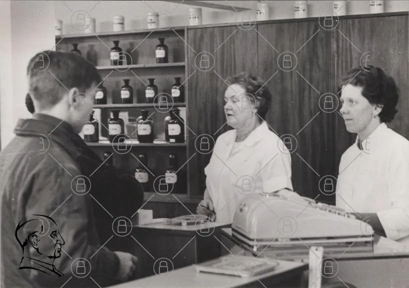 apotek, personal, kunder, flaskor, medicin, disk, gammal, svartvit, interiör, service, 1900-tal, butik, hälsa, recept, traditionell, varor, försäljning, professionell, ansiktsuttryck, samtal, arbetsmiljö, vintage, apotekare, kundservice, hyllor, produkter, medicinska, samhälle, historia