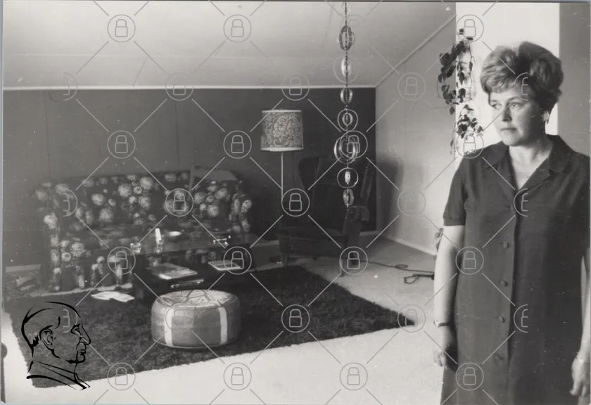 inredning, vardagsrum, soffa, lampa, matta, kvinna, retro, svartvitt, dekoration, bord, böcker, vägg, stol, väggprydnad, 1960-tal, stil, heminredning, möbler, rum, design