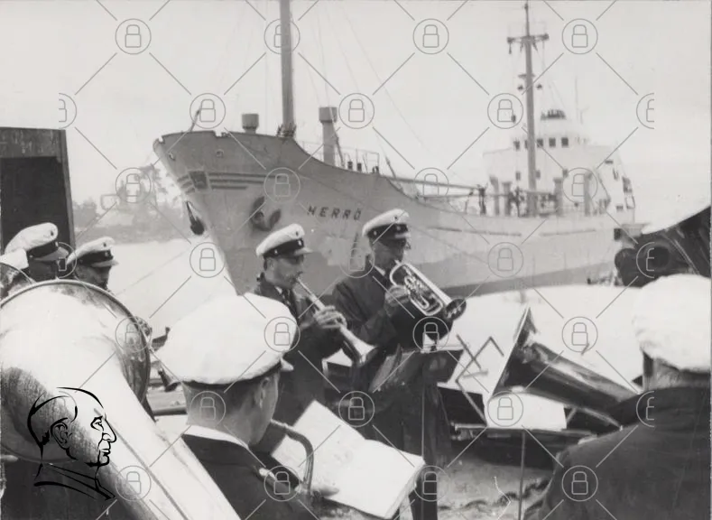 musiker, brassband, sjö, båt, hamn, uniform, trumpet, tuba, svartvitt, orkester, maritim, tradition, konsert, fest, 1900-tal, musik, sjöfart, herro, instrument, sjöman