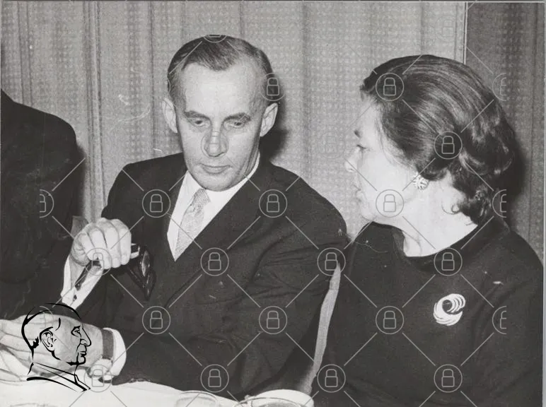 svartvitt, fotografi, man, kvinna, kostym, klänning, bord, samtal, 1960-tal, vintage, eleganta, socialt, event, ansikten, kläder, stil, uttryck, interaktion, historiskt, dokumentär