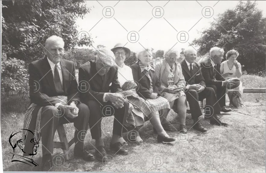 personer, äldre, män, kvinnor, hattar, kostymer, bänkar, utomhus, svartvitt, samling, tradition, ansikten, kläder, sitta, grönska, fotografering, minnen, generationer, socialt, gemenskap