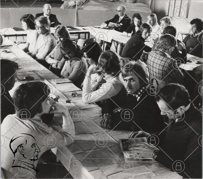möte, konferens, människor, bord, diskussion, 1970-tal, svartvitt, kläder, inomhus, samling, studenter, utbildning, anteckningar, papper, fokus, grupp, interaktion, sittande, professionell, social, lärande, presentation, samtal, forskning, arbete, klassrum, evenemang, traditionell, stil, allvarlig