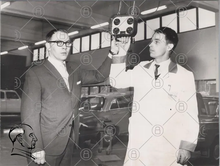 svartvitt, män, teknik, verkstad, maskin, mätinstrument, 1960-tal, kläder, professionell, bilar, industri, forskning, experiment, laboratoriemiljö, interiör, arbete, innovation, säkerhet, mätning, presentation, historisk, retro, ingenjör, utbildning, samarbete, utrustning, manuell, kontroll, precision, teknikern