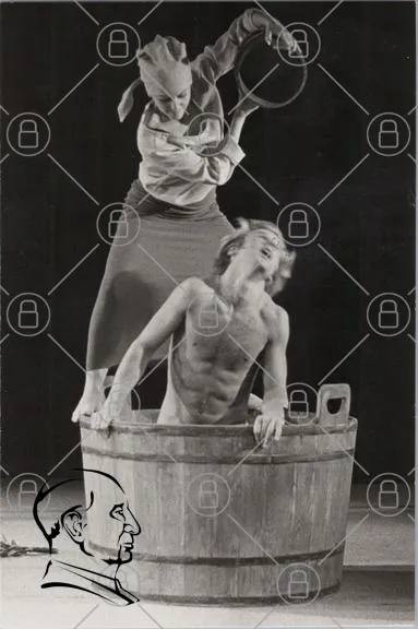 dans, teater, svartvitt, scen, kostym, man, kvinna, träbadkar, uttryck, rörelse, dramatik, konst, performance, 1900-tal, kroppsspråk, skådespelare, historisk, kultur, föreställning, känsla, interaktion