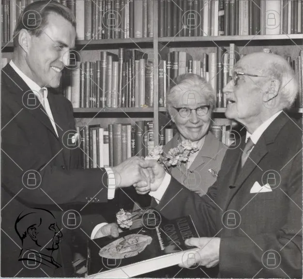 man, kvinna, bok, bibliotek, handskakning, glasögon, blommor, svartvitt, porträtt, 1900-tal, kläder, leende, samarbete, kultur, historia, evenemang, akademisk, utmärkelse, presentation, artister, litteratur, fotografering, tradition, gemenskap, vänskap, gest, uttryck, intellektuell, diskussion, minne